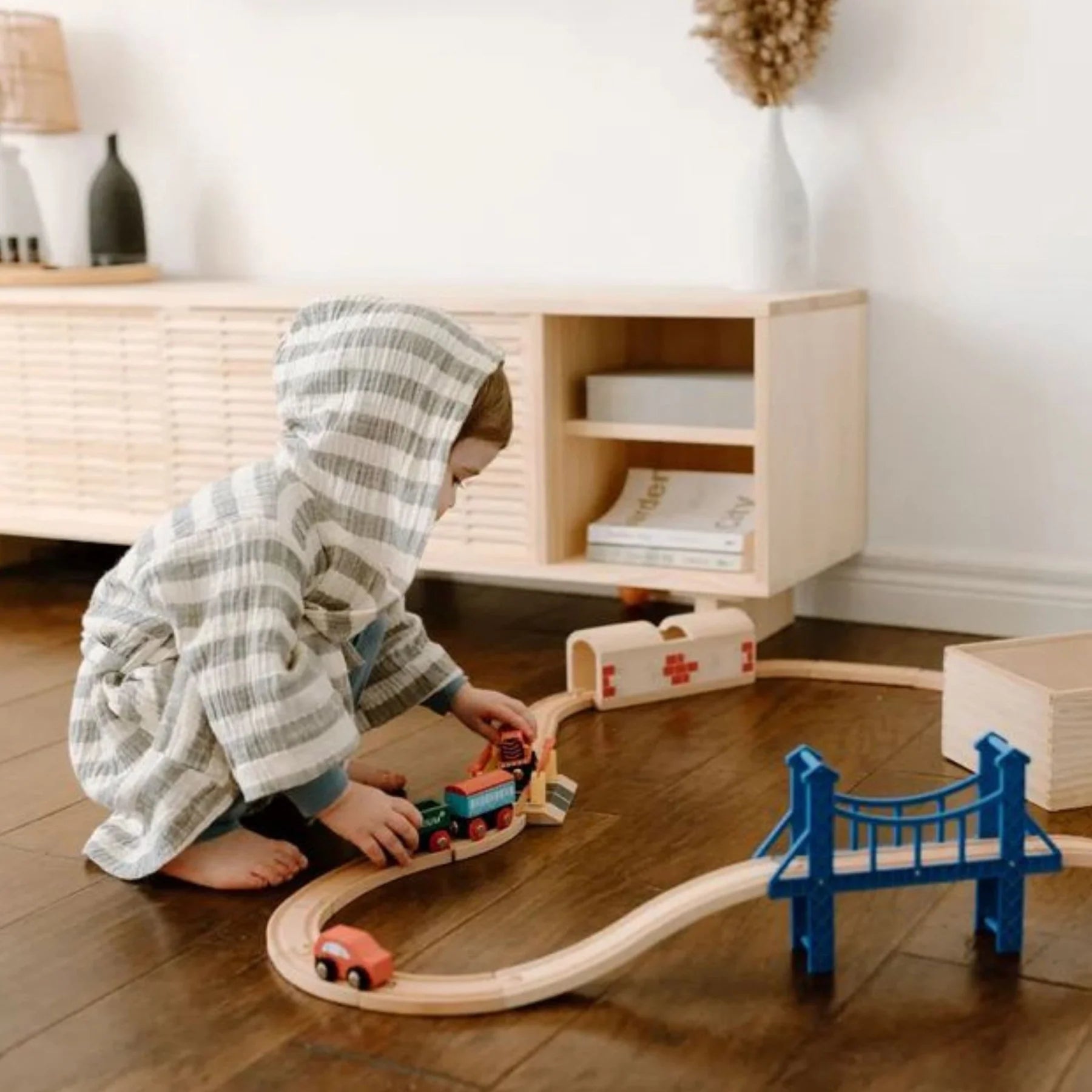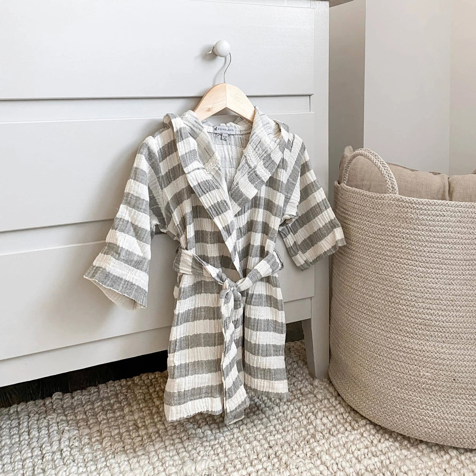 Dress your little Poko in this luxuriously-soft crinkled muslin fabric that is gentle on their skin, striped for character, and adds a functional and durable touch to their wardrobe. This robe is sand-resistant, machine-washable, high-quality, lightweight, absorbent, and quick-drying.