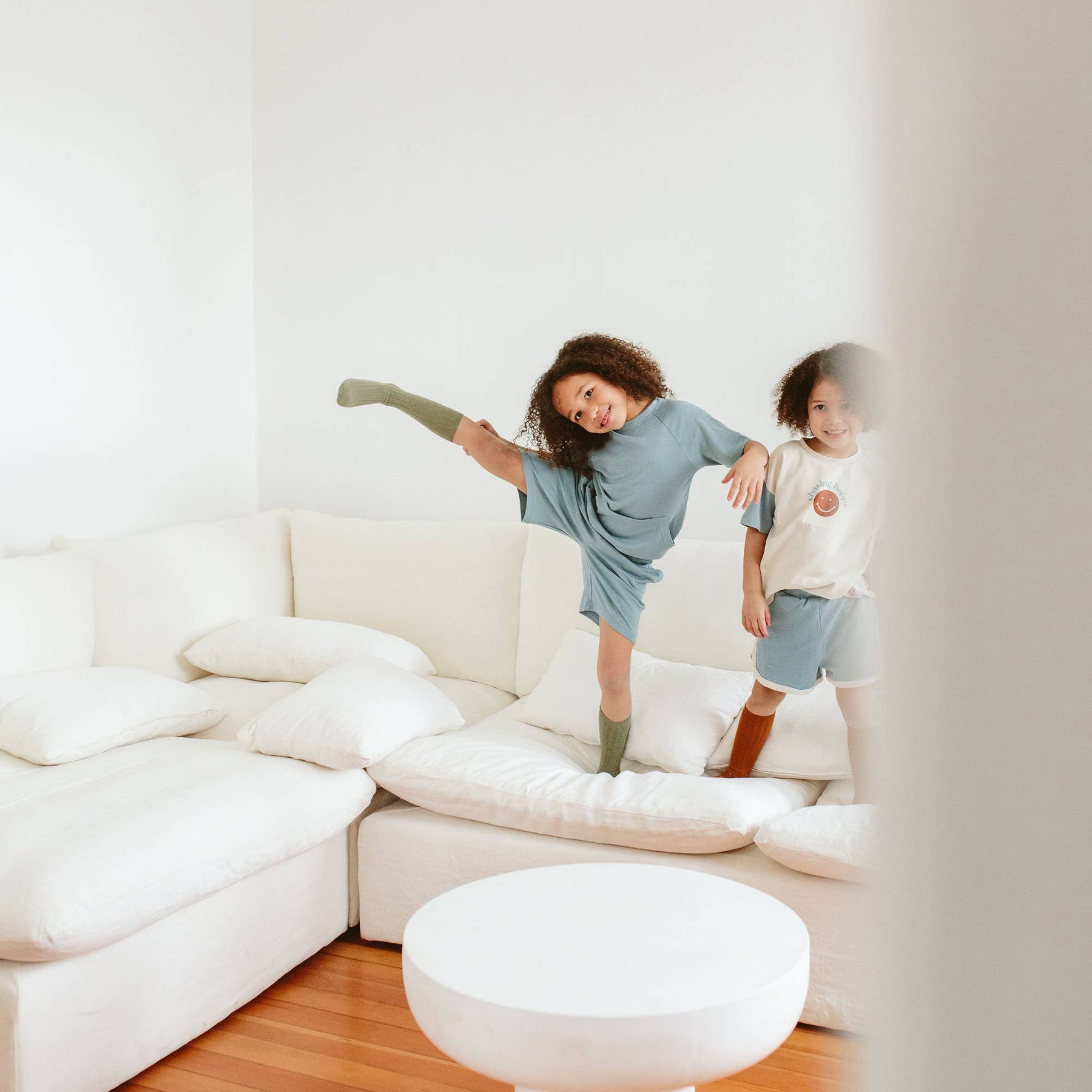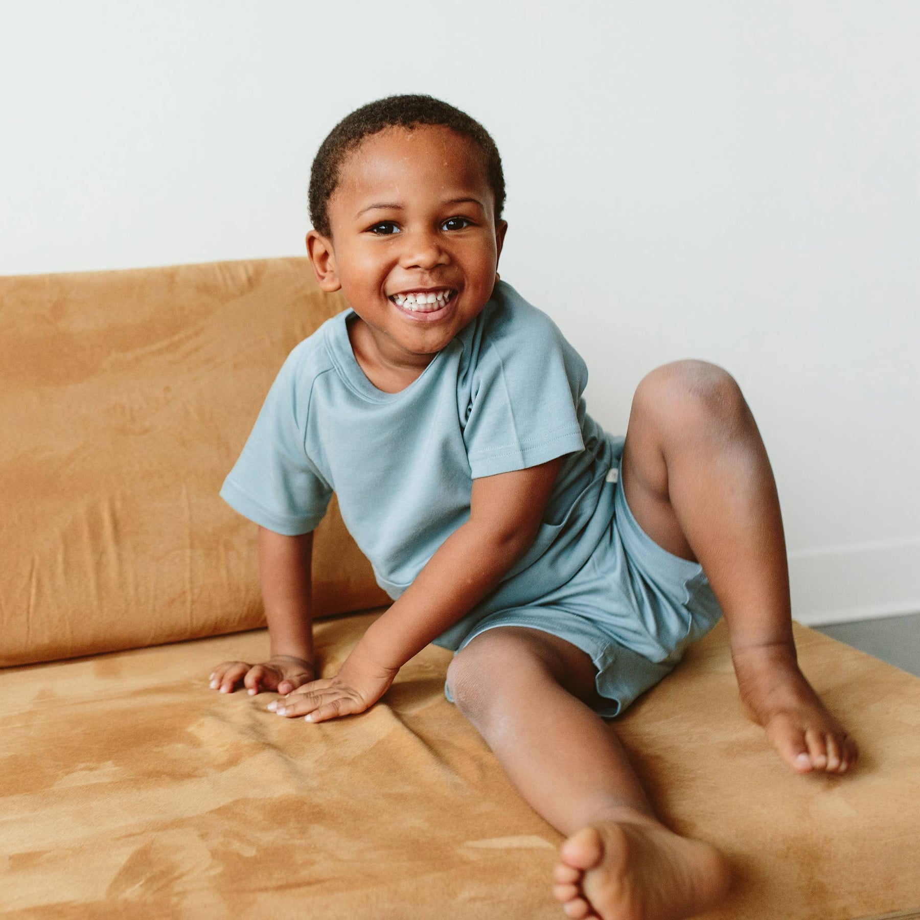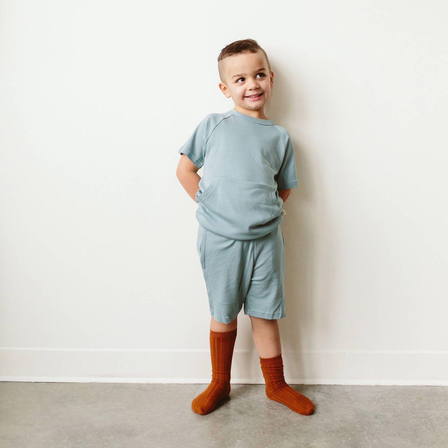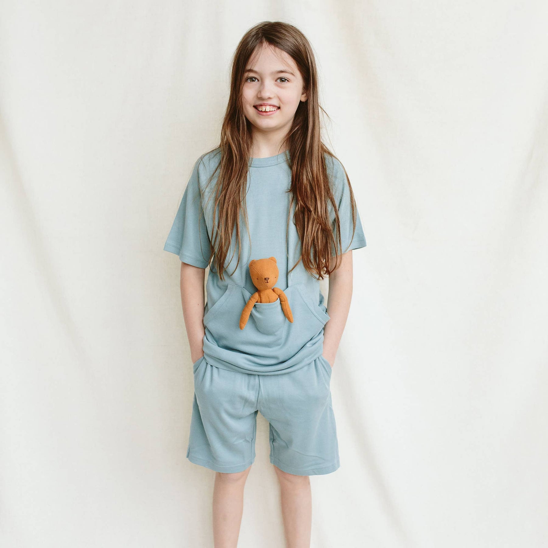 The perfect short sleeve and shorts adventure layering set! Designed with exploration in mind. Featuring a kangaroo pocket in front for all the treasures you find along the way. Fabric: 70% viscose from bamboo/30% organic cotton Care: Machine wash on low or delicate. Dry on gentle/low or line dry.