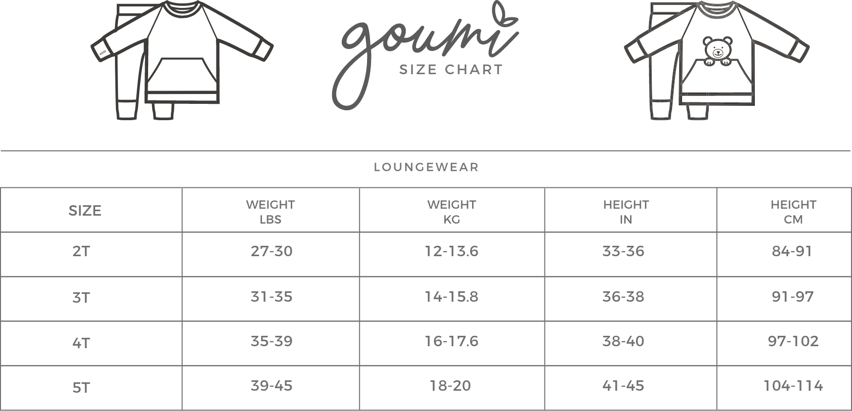 Never outgrow your goumi. Our newest pajama separates for sizes up to 5T. cozy feet: peek-a-boo heels for keeping their arches warm, warm hands: thumb pockets for epic thumb-wars, home for a friend: Front pocket for carrying around their special lovey.  Machine Wash.
