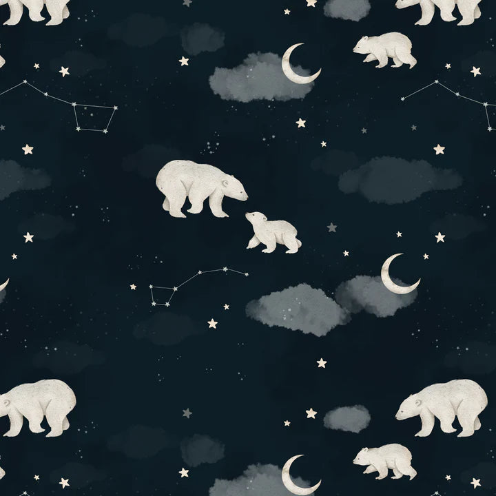 Fabric is digitally printed with our custom POLAR BEARS print. This wintery print features mama and cub polar bears, stary sky and constellations with a deep blue background.