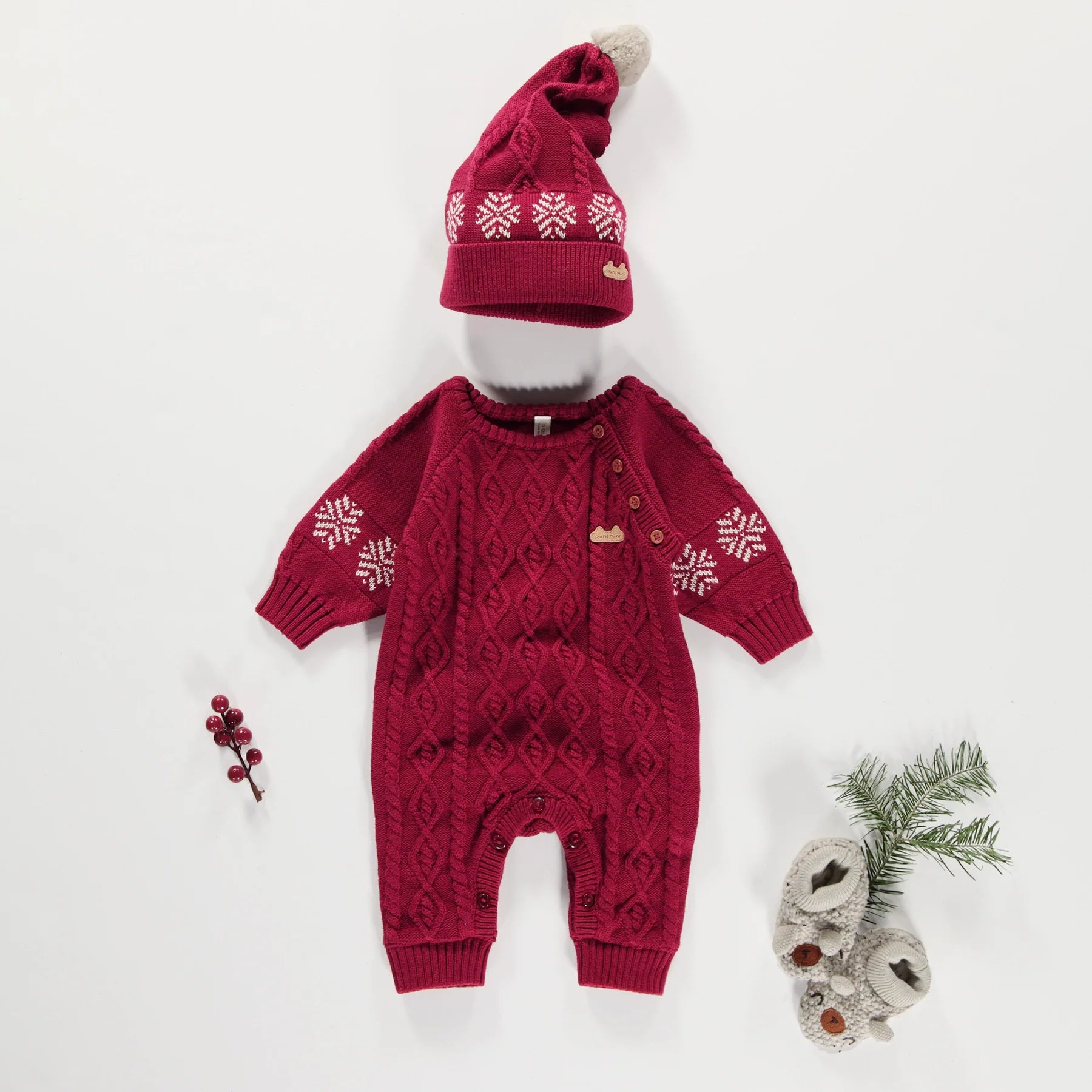 One-piece made from a soft, warm knit designed to cuddle baby's delicate skin. Note the twisted details in the stitches and the snowflake print.
