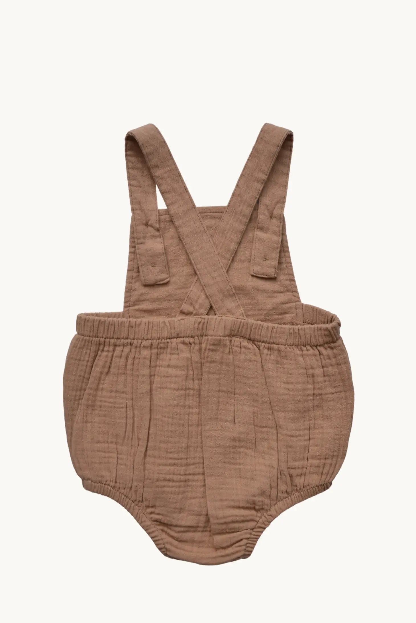 Overalls with a straight neckline featuring bamboo buttons at the front, snap-button fastening at the gusset, and an elastic waistband at the waist.