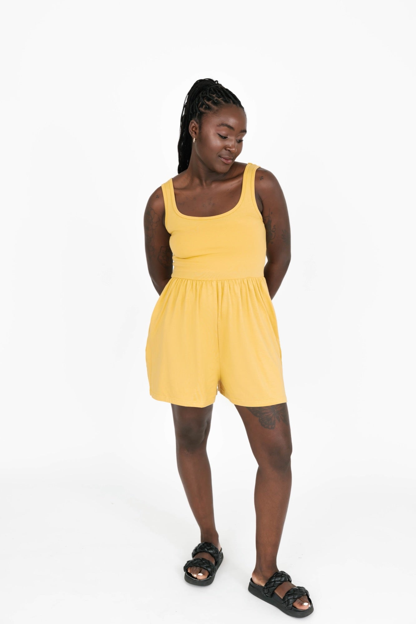 One of our most popular silhouettes just got another summer shortening. When a style is as loved as the Camille, you know we have to create a sunny day version! All the features you know and love included a fitted tank-style top and soft gathered legs cut into shorts! The comfortable waist seams hits just right giving it a sporty chic vibe that could easily be taken from the pickleball courts to the happy hour patios!