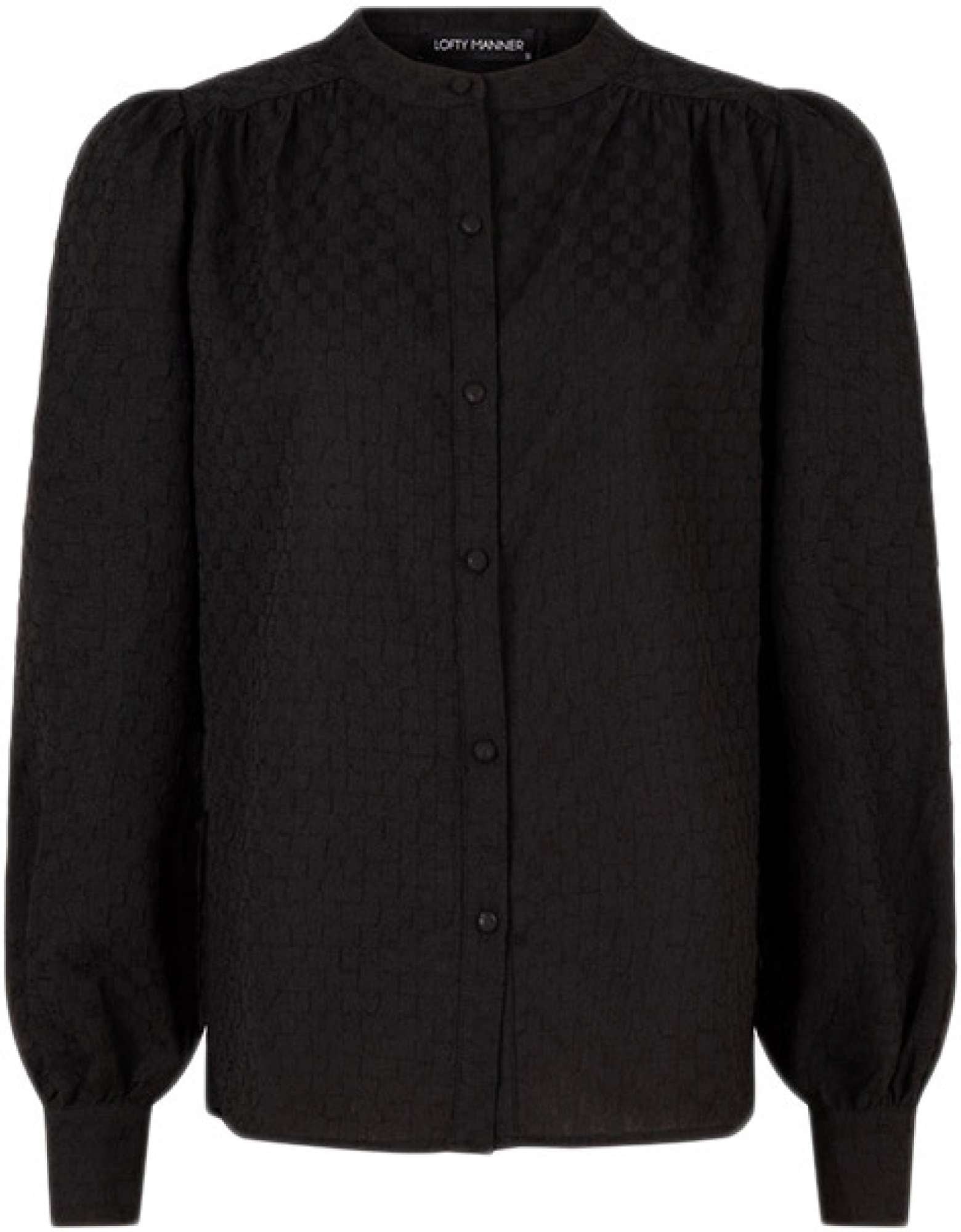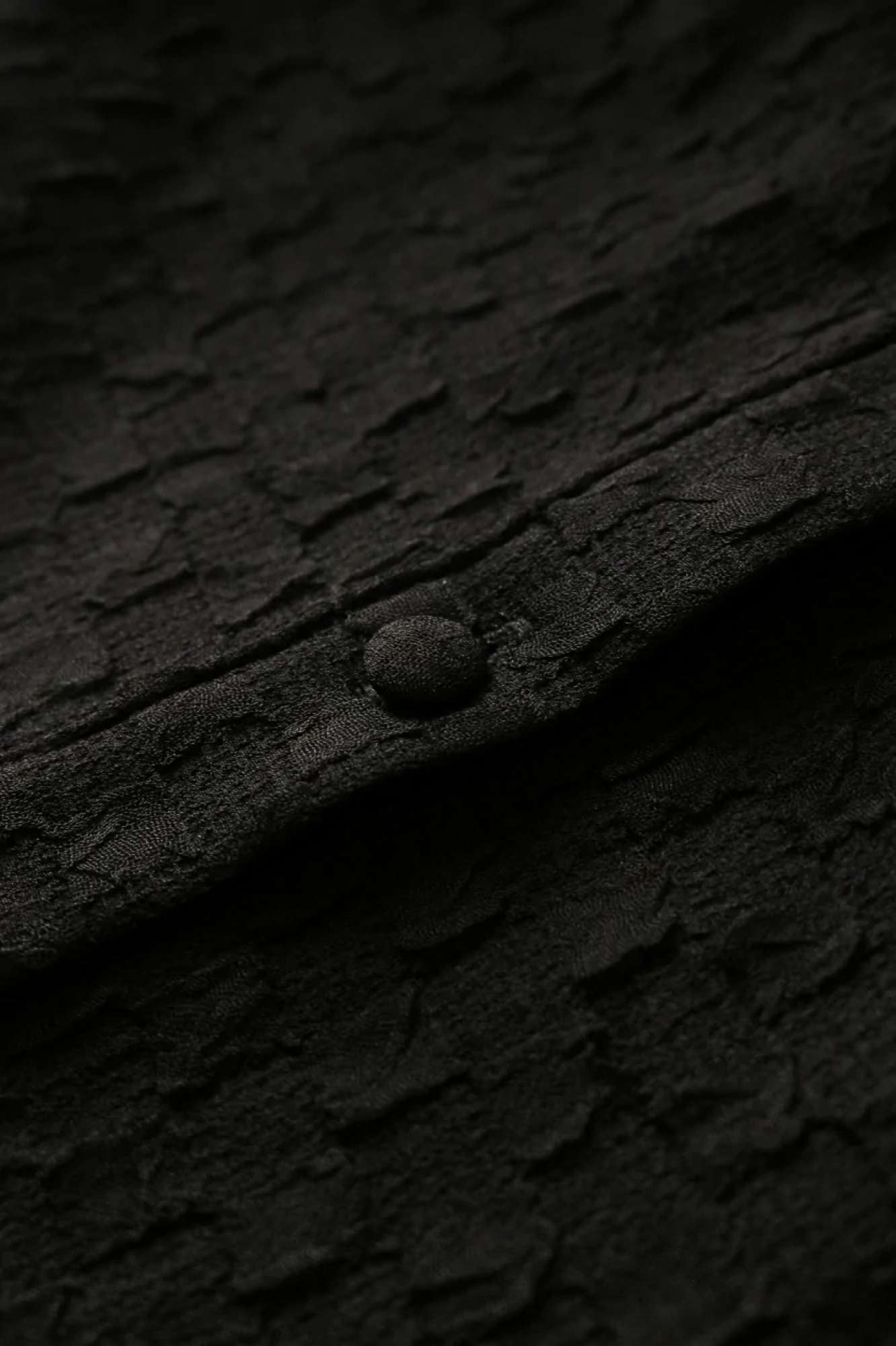 The Ebony Blouse elevates classic style with its understated patterned fabric and sleek front button detailing. Its dramatic wide sleeves cinch elegantly at the wrists with buttoned cuffs, creating a striking silhouette. Designed with a relaxed, effortlessly chic fit, this versatile piece pairs perfectly with tailored slacks, edgy jeans, or flowy skirts.