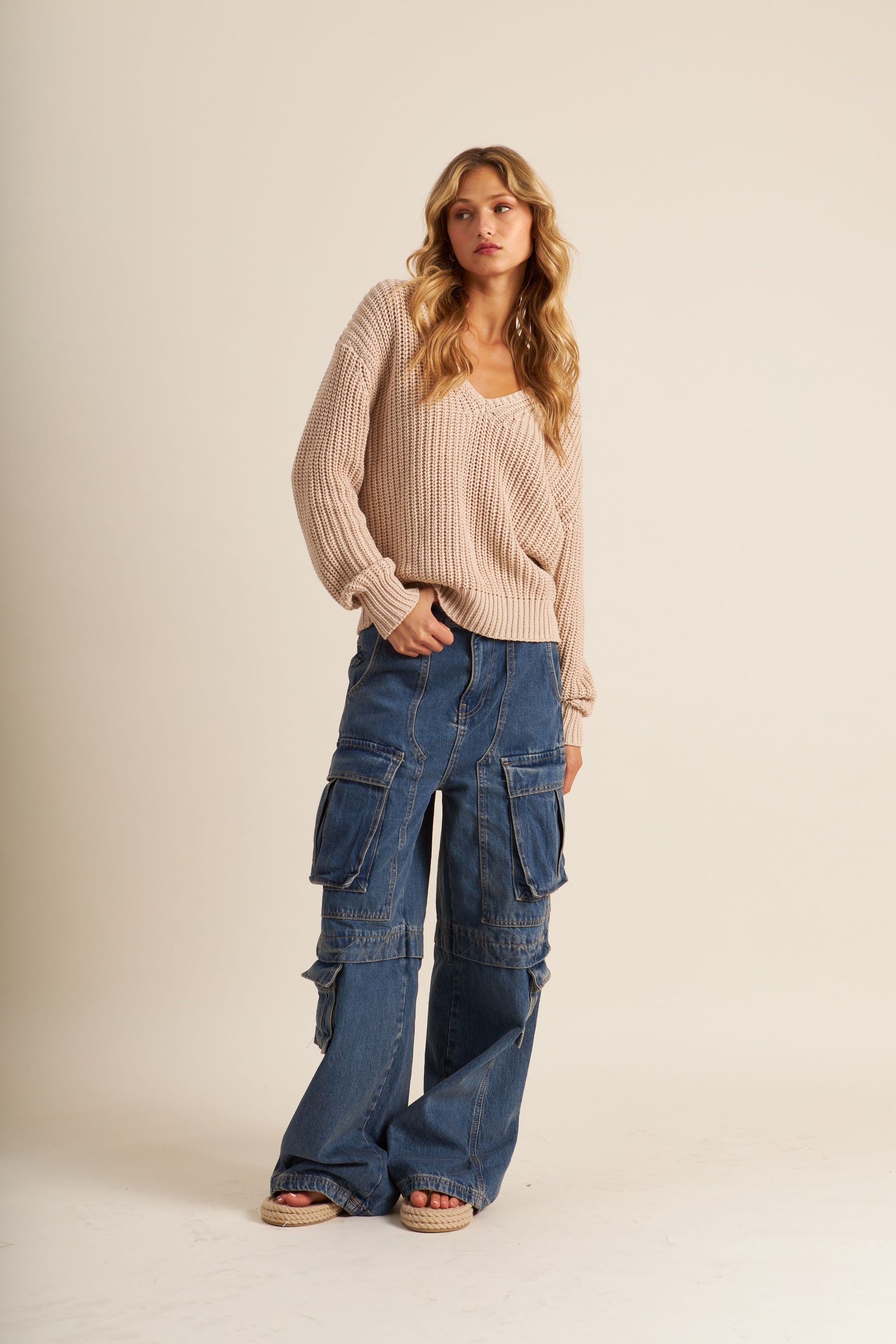 Beautiful spring knit cardigan - cropped in length, slightly oversized sleeve.  Loosely knit with 3 button closure.  Cutest little flower accent button.  Pair with white wide legs or your favourite cargos.