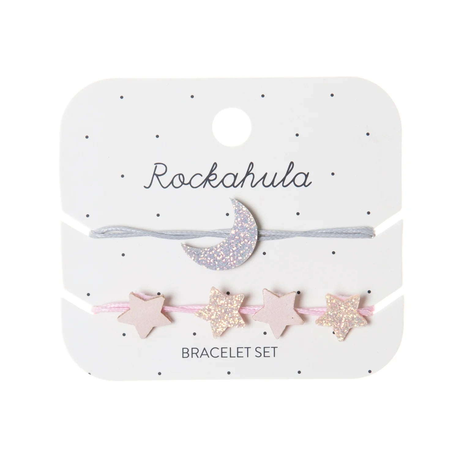 Shoot for the moon and land amongst the stars with our gorgeous moonlight jewelry set. This set of two bracelets features a gorgeous opal moon on a grey cord, and a string of shimmering pink stars on a pastel pink cord. With a lobster clasp fastening and extender chain to ensure the perfect fit.