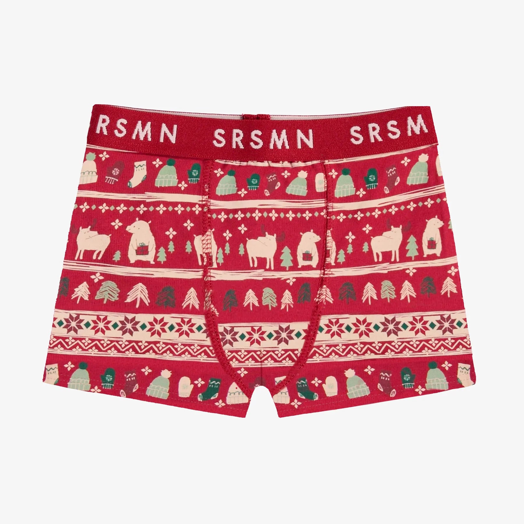 Red fitted boxer with a holiday pattern, bringing together everything reminiscent of cold weather in a pretty fresco: toques, mittens, warm socks and animals. The fit is very comfortable and close to the body.