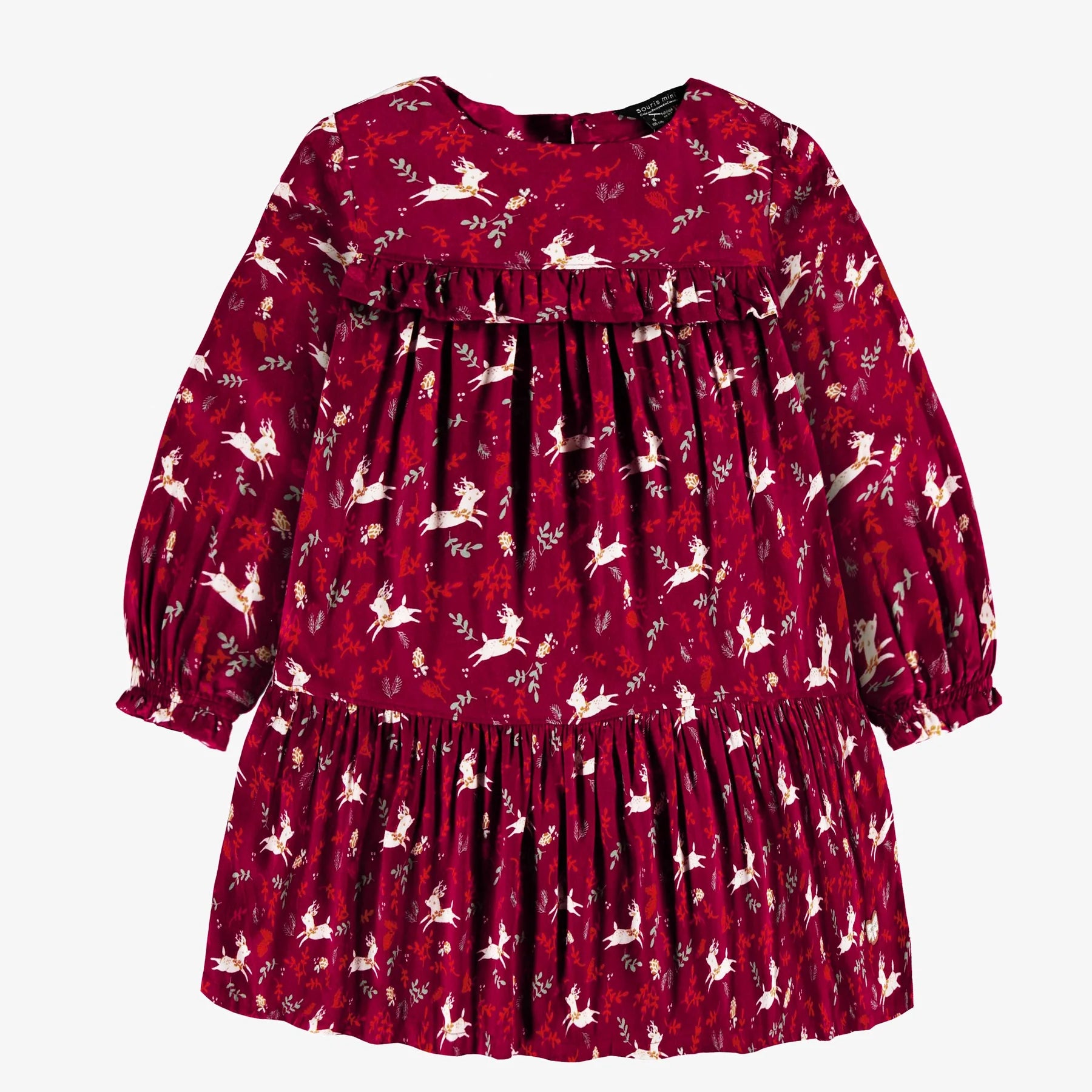 Bring festive charm to your child's wardrobe with this adorable red holiday dress, designed with long puffed sleeves and an enchanting all-over print of reindeer, foliage, and pinecones. Delicate ruffles and gathered front detailing add a touch of romance and elegance to this timeless piece—perfect for Christmas parties, family photos, or special occasions all winter long.